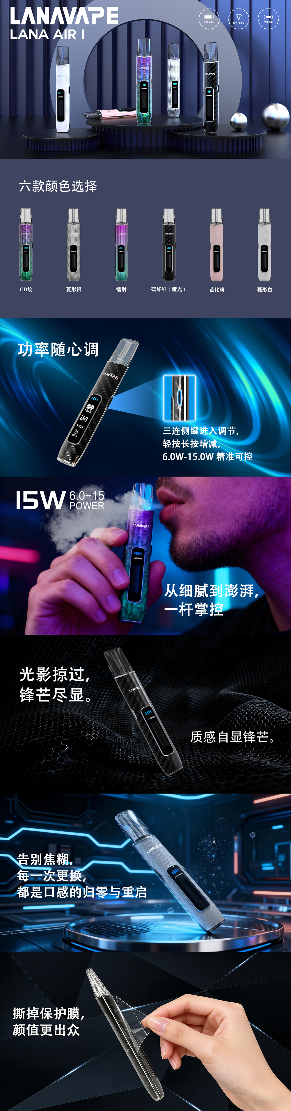 LANA AIR 1 新品主機震撼登場!具備 6.0W-15W 精準功率調控,三連側鍵輕鬆切換。提供幻彩、鐳射、碳纖維等六款科技配色,質感自顯鋒芒。獨家霧化技術告別焦糊感,每一口都是口感的歸零與重啟。一文看懂 LANA AIR 1 核心優勢與操作指南